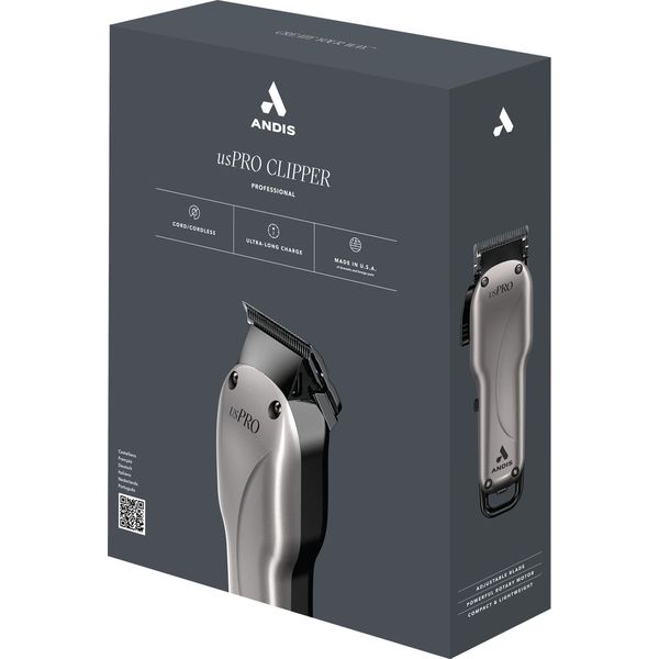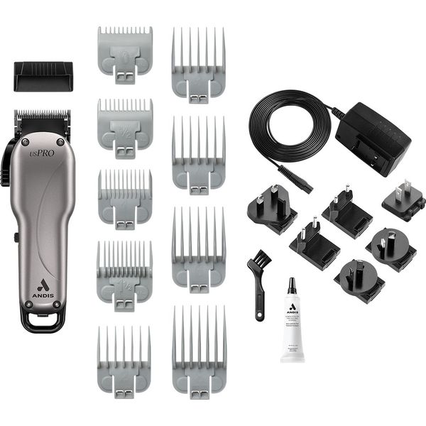 Η επαναφορτιζόμενη επαγγελματικη κουρευτική μηχανή US PRO της ANDIS διαθέτει περιστροφικό μοτέρ υψηλής απόδοσης, προσφέροντας 5500 κινήσεις το λεπτό για εξαιρετική αποτελεσματικότητα, ταχύτητα και ακρίβεια. Δαιθέτει λεπίδες από ανθρακούχο ατσάλι., διακόπτη on/off για εύκολη χρήση και είναι έως και 25% πιο ελαφρυά από την US PRO. Προσφέρει πλάτος κοπής 4.5 cm, με ρυθμιζόμενο μήκος κοπής (000-1mm) και ελάχιστο μήκος κοπής 0.5mm. Περιλαμβάνει 9 χτενάκια (1.5mm, 2.5mm, 3mm, 4.5mm, 6mm, 9.5mm, 13mm, 19mm, 25mm) και επαναφορτιζόμενη μπαταρία λιθίου με χρόνο φόρτισης 90 λεπτών και αυτονομία 120 λεπτών. Επιπλέον αξεσουάρ περιλαμβάνουν 6 εναλλάξιμους αντάποτρες ρεύματος, καλώδιο φόρτισης με αντάπτορα, βουρτσάκι καθαρισμού και λάδι λίπανσης λεπίδων. Με βάρος 275g και διαστάσεις 18x5.5x4 cm, είναι ιδανικό για επαγγελματική χρήση.
