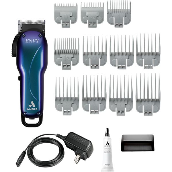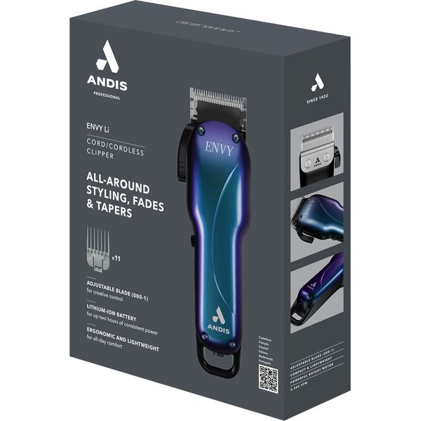 Η επαναφορτιζόμενη επαγγελματικη κουρευτική μηχανή ENVY Li της ANDIS διαθέτει περιστροφικό μοτέρ υψηλής απόδοσης, προσφέροντας 5500 κινήσεις το λεπτό για εξαιρετική αποτελεσματικότητα, ταχύτητα και ακρίβεια. Έρχεται με λεπίδες κατασκευασμένες από ανθρακούχο ατσάλι, εργονομικό σχεδιασμό και διακόπτη on/off για εύκολη χρήση. Προσφέρει πλάτος κοπής 4.5 cm, με ρυθμιζόμενο μήκος κοπής (000-1mm) και ελάχιστο μήκος κοπής 0.5mm. Περιλαμβάνει 11 χτενάκια (1.5mm, 2.4mm, 3mm, 4.5mm, 6mm, 10mm, 13mm, 16mm, 19mm, 22mm, 25mm) και επαναφορτιζόμενη μπαταρία λιθίου με χρόνο φόρτισης 90 λεπτών και αυτονομία 120 λεπτών. Επιπλέον αξεσουάρ περιλαμβάνουν 6 εναλλάξιμους αντάπτορες ρεύματος, καλώδιο φόρτισης με αντάπτορα, βουρτσάκι καθαρισμού και λάδι λίπανσης λεπίδων. Με βάρος 276g και διαστάσεις 18x6x4 cm, είναι ιδανικό για επαγγελματική χρήση.