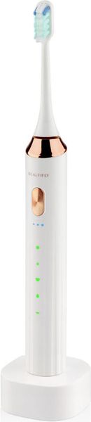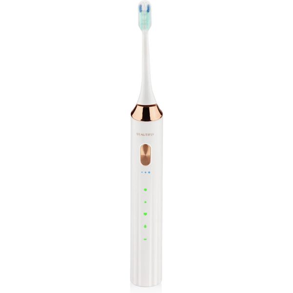 Τέλεια στοματική υγιεινή με την οδοντόβουρτσα White Smile της Beautifly! Με ισχύ 1.8W και 38,000 ηχητικές δονήσεις ανά λεπτό, αφαιρεί έως και 100% της οδοντικής πλάκας. Διαθέτει κεφαλή βουρτσίσματος με υπερήχους και προσφέρει 5 διαφορετικούς τρόπους καθαρισμού: απαλή λειτουργία, λεύκανση, καθαρισμός, γυάλισμα και προστασία. Έχει 3 επίπεδα έντασης και φωτεινές ενδείξεις λειτουργιών. Η μπαταρία της διαρκεί έως 45 ημέρες και φορτίζει πλήρως σε 120 λεπτά. Είναι 100% αδιάβροχη (IPX7) και μπορεί να χρησιμοποιηθεί ακόμα και στο ντους. Διαθέτει χρονοδιακόπτη 2 λεπτών για κάθε λειτουργία και προστασία υπερφόρτωσης. Χαρακτηριστικά: -Κεφαλή βουρτσίσματος με υπερήχους που αφαιρεί έως και 100% της οδοντικής πλάκας, για μέγιστη καθαριότητα και υγιή ούλα. -5 διαφορετικοί τρόποι καθαρισμού για εξατομικεύμένο βούρτσισμά: Απαλή λειτουργία, Λεύκανση, καθαρισμός, γυάλισμα και προστασία. -3 επίπεδα έντασης. -Φωτεινές ενδείξεις λειτουργιών. -Εξαιρετικά μεγάλη διάρκεια της μπαταρίας έως και 45 μέρες. -Πλήρης Φόρτιση: 120 λεπτά. -Χωρητικότητα μπαταρίας: 1200mA. -Ένδειξη Μπαταρίας: Κόκκινο φως αναβοσβήνει όταν χρειάζεται φόρτιση. -Προστασία υπερφόρτωσης. -Χρονοδιακόπτης 2 λεπτών σε κάθε λειτουργία.Ισχύς: 1.8W.Επίπεδο αδιάβροχης προστασίας: IPX7: 100% αδιάβροχη, μπορεί να χτρησιμοποιηθεί ακόμα και κατά τη διάρκεια του ντους. Βάρος: 99g. Διαστάσεις:24.5x2.7cm. Χρώμα: Λευκό.Εγγύηση: 2 χρόνια.