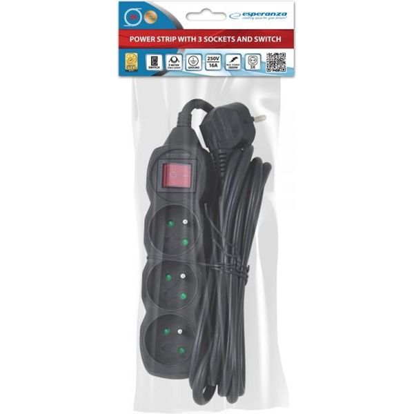 ESPERANZA ELK211K POWER STRIP 3 ΜΠΡΙΖΕΣ ΜΕ ΔΙΑΚΟΠΤΗ 3M BLACK