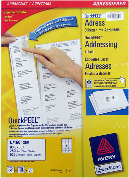 Αυτοκόλλητες ετικέτες Avery σε φύλλα Α4. Ιδανικά για όλους τους laser εκτυπωτές. Οι ετικέτες Quick-Dry στεγνώνουν πιο γρήγορα και δεν ''ανοίγει'' το χρώμα. Ζωντανά χρώματα χωρίς μουτζούρες. Διαστάσεις: 63,5 x 38,1 mm. Χρώμα:Λευκό. Ετικέτες ανά Φύλλο: 21. Ετικέτες ανά Πακέτο:5250. Φύλλα ανά πακέτο:250.OEM: L7160