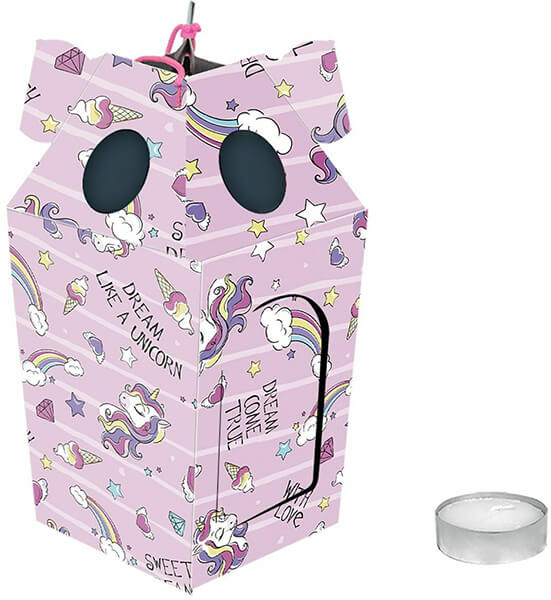 Φαναράκ σε ροζ χρώμα και σχέδια με μονόκερους, με κεράκι ρεσώ.