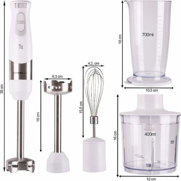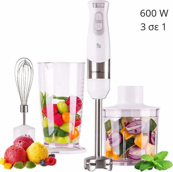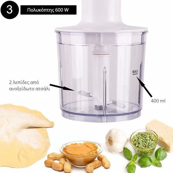 Ραβδομπλέντερ, πολυκόφτης και μίξερ με ισχύ 600W. Διαθέτει 2 ταχύτητες με 5 επίπεδα στην κάθε μία για απόλυτα ακριβή έλεγχο της ταχύτητας που χρησιμοποιείτε κάθε φορά. Είναι κατασκευασμένο από ανοξείδωτο ατσάλι για να μπορεί να χρησιμοποιηθεί ακόμα και σε ζεστά υλικά όπως σούπες και σάλτσες. Μπορείτε να εναλλάσσετε τα εξαρτήματα για διαφορετικές χρήσεις εύκολα και γρήγορα, και όλα τα εξαρτήματα πλένονται και στο πλυντήριο πιάτων. Περιλαμβάνεται δοχείο 700 ml με ενδείξεις μέτρησης και η χωρητικότητα του δοχείου του πολυκόφτη είναι 400 ml. - Ραβδομπλέντερ, πολυκόφτης και μίξερ 3 σε 1