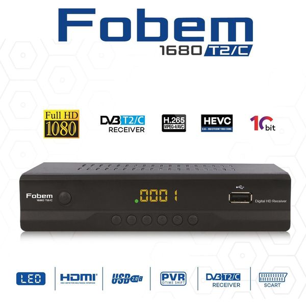 Ο Επίγειος Δέκτης FOBEM 1680 T2/C είναι ο νέος δέκτης τηλεόρασης με υποστήριξη H.265, σχεδιασμένος για επίγειο σήμα DVB-T/T2 και αναλογικό σήμα DVB-C. Το συμπαγές και μεταλλικό του κουτί προσφέρει στιβαρή κατασκευή, ενώ η οθόνη LED με ενσωματωμένα κουμπιά καθιστά τη λειτουργία εύκολη και άμεση. Ο δέκτης διαθέτει θύρα USB για εγγραφή και αναπαραγωγή αρχείων, ελληνικό μενού, ηλεκτρονικό οδηγό προγράμματος (EPG), υποστήριξη υποτίτλων και TELETEXT, καθώς και εξόδους SCART και HDMI για σύνδεση με τηλεοράσεις. Η συσκευασία περιλαμβάνει καλώδιο HDMI και εγχειρίδιο χρήσης στα ελληνικά, ενώ το εξωτερικό τροφοδοτικό 12V εξασφαλίζει χαμηλή κατανάλωση ενέργειας και ασφαλή λειτουργία.