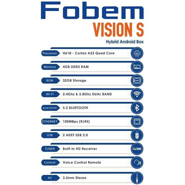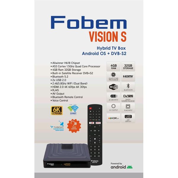 Το Android Box & Δορυφορικός Δέκτης FOBEM VISION S συνδυάζει τις δυνατότητες ενός σύγχρονου Android Box με έναν πλήρη δέκτη DVB-S2, επιτρέποντάς σας να απολαμβάνετε τόσο διαδικτυακές εφαρμογές όσο και τα αγαπημένα σας δορυφορικά κανάλια. Με τον τετραπύρηνο επεξεργαστή H618 Cortex A53, 4 GB DDR3 RAM και 32 GB εσωτερική μνήμη, οι εφαρμογές τρέχουν γρήγορα και ομαλά, ενώ η σύνδεση Ethernet και τα dual-band Wi-Fi 2.4/5.8 GHz προσφέρουν υψηλές ταχύτητες για streaming και εγκατάσταση εφαρμογών. Υποστηρίζει ανάλυση βίντεο έως 6K Ultra HD με HDR10+, προσφέροντας εξαιρετική ποιότητα εικόνας για ταινίες και τηλεοπτικές σειρές. Ο ενσωματωμένος δέκτης HD DVB-S2 και το τηλεχειριστήριο με δυνατότητα φωνητικού ελέγχου καθιστούν τη χρήση εύκολη και άνετη. Διαθέτει επίσης 2 θύρες USB 2.0, HDMI 2.0 με 4K/60fps, AV 3,5mm stereo και Bluetooth 5.2 για σύνδεση περιφερειακών.