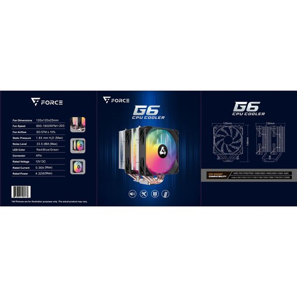 < - O FORCE CPU COOLER G6 245W είναι ένα σύστημα ψύξης επεξεργαστή με υψηλή απόδοση και εντυπωσιακό φωτισμό RGB. - Ο σχεδιασμός υψηλής ροής αέρα, οι έξι σωλήνες θερμότητας και η αλουμινένια ψύκτρα εξασφαλίζουν αποτελεσματική απαγωγή θερμότητας, διατηρώντας τον επεξεργαστή σας δροσερό ακόμη και υπό πίεση. - Ο ανεμιστήρας λειτουργεί με ρουλεμάν υδραυλικού τύπου για αθόρυβη και μακροχρόνια λειτουργία, με ελάχιστο θόρυβο και αυξημένη αποδοτικότητα. -Υποστηρίζει πλήθος socket τόσο της Intel όσο και της AMD.