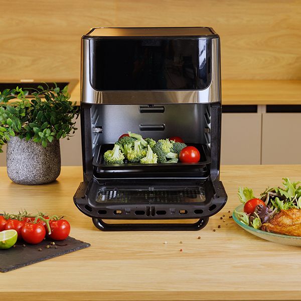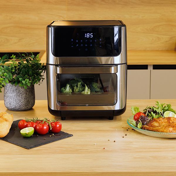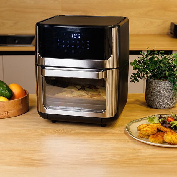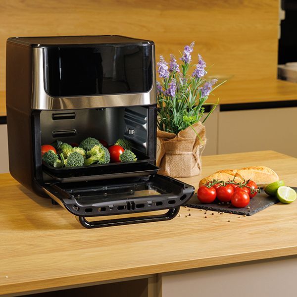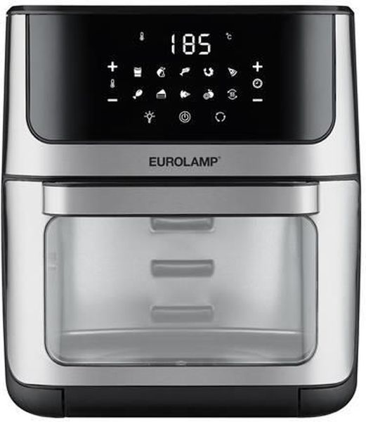 Η φριτέζα αέρος Eurolamp XXL 12L με ισχύ 1800W και χωρητικότητα 12 λίτρα προσφέρει μεγάλη ευελιξία στο μαγείρεμα, συνδυάζοντας πλαστικό και INOX για ανθεκτικότητα και κομψή εμφάνιση. Διαθέτει παράθυρο παρατήρησης με φωτισμό, ψηφιακή οθόνη αφής LCD και 10 έξυπνα προεπιλεγμένα προγράμματα για εύκολο και ακριβές μαγείρεμα. Ο ρυθμιζόμενος θερμοστάτης επιτρέπει λειτουργία από 30°C έως 200°C, ενώ η προστασία υπερθέρμανσης και η λυχνία ένδειξης λειτουργίας εξασφαλίζουν ασφάλεια. Η φριτέζα περιλαμβάνει αφαιρούμενο δίσκο για εύκολο καθαρισμό, κάδο με αποσπώμενη χειρολαβή, δίσκο περισυλλογής λαδιών, διάτρητο ταψί ψησίματος, περιστρεφόμενη σούβλα και περιστρεφόμενο καλάθι τηγανίσματος με λαβή τοποθέτησης. - Τάση Τροφοδοσίας: 220240V