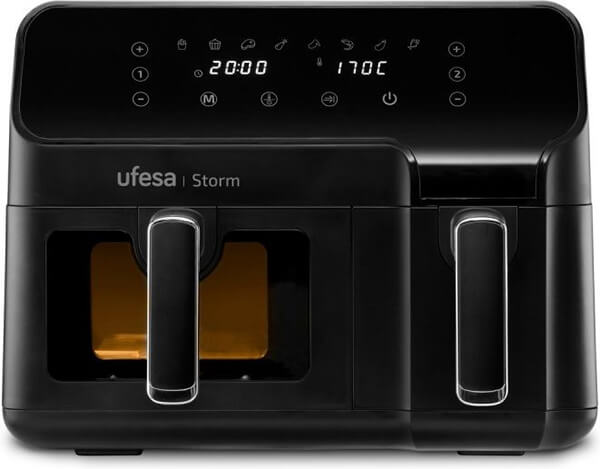 Η φριτέζα αέρος της Ufesa με ισχύ 2700W και κάδο με χωρητικότητα 9 λίτρα (5.5 lt + 3.5 lt), είναι μια ιδανική λύση για να μαγειρεύετε πιο υγιεινά και οικονομικά σε σχέση με τις κλασικές φριτέζες, καθώς χρειάζεται ελάχιστο λάδι. Εκτός από πατάτες μπορείτε να μαγειρέψετε διάφορα φαγητά όπως κοτόπουλο ή λαχανικά. Διαθέτει αποσπώμενο κάδο για να καθαρίζεται ευκολότερα και ρυθμιζόμενο θερμοστάτη για να μπορείτε να μαγειρέψετε φαγητά που απαιτούν διαφορετικές θερμοκρασίες ψησίματος.