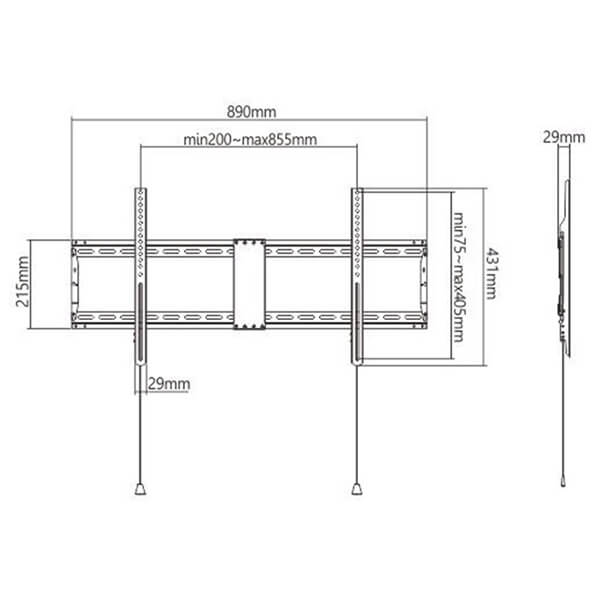 Βάση τηλεόρασης τοίχου (σταθερή), 43"-90" (70 kg). -Τοποθετήστε τέλεια την οθόνη σας. -Ελαφριά και επίπεδη σχεδίαση. -Aπό χάλυβα βαρέως τύπου. -Υποστηρίζει τις περισσότερες τηλεοράσεις LCD/Plasma 43" - 90". -Συμβατό με VESA, μέγ. 800 mm x 400 mm. -Απόσταση από τον τοίχο: 29 mm. -Περιλαμβάνει όλα τα απαραίτητα υλικά εγκατάστασης Μέγεθος οθόνης: 43" - 90".Συμβατό με Vesa: 200x200, 300x200, 400x200, 300x300, 400x300, 400x400, 600x400, 800x400 mm.Αντοχή βάρους: 70 kg.Προφίλ: 29 mm.Χρώμα: μαύρο.Τοποθέτηση: συμπαγής τοίχος, διπλό καρφί (406mm/450mm/600mm).Καθαρό βάρος: 2.37 kg.Εγγύηση: 2 χρόνια. DOA 7 ημερών