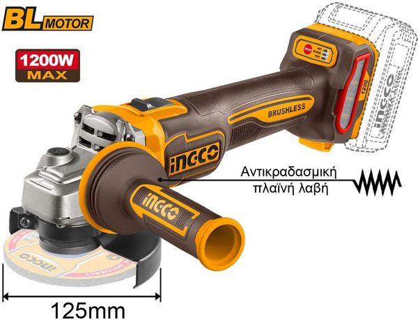 ΓΩΝΙΑΚΟΣ ΤΡΟΧΟΣ ΜΠΑΤΑΡΙΑΣ 125MM 20V LI-ION SOLO ΜΕ ΑΝΤΙΚΡΑΔΑΣΜΙΚΗ ΠΛΑΪΝΗ ΛΑΒΗ INGCO CAGLI212027E TLS.391955 INGCO INGCO ΤΡΟΧΟΙ