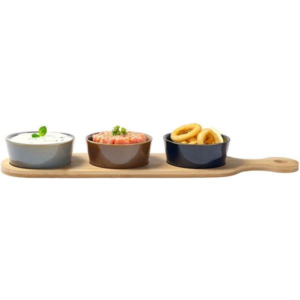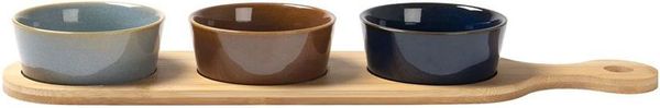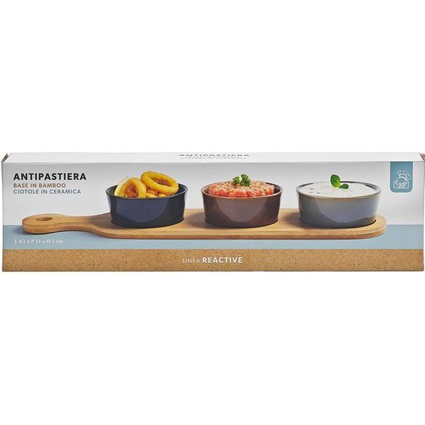 Η GUSTO CASA Ορντεβιέρα 3 Θέσεων REACTIVE με βάση από φυσικό μπαμπού συνδυάζει κομψότητα και πρακτικότητα, αποτελώντας ιδανική επιλογή για εντυπωσιακό σερβίρισμα στο καθημερινό τραπέζι ή σε καλεσμένους. Ο φυσικός χαρακτήρας του μπαμπού προσδίδει ζεστασιά, ενώ τα κεραμικά μπολ με σμάλτο ολοκληρώνουν το σύνολο με μοντέρνα αισθητική. Η επιμήκης βάση διαστάσεων 43x11 cm προσφέρει άνεση στην τοποθέτηση και σταθερότητα κατά το σερβίρισμα, ενώ τα τρία κεραμικά μπολ είναι ιδανικά για finger foods, ντιπ, ελιές, σνακ και συνοδευτικά. Τα μπολ καθαρίζονται εύκολα και είναι κατάλληλα για χρήση σε πλυντήριο πιάτων και φούρνο μικροκυμάτων, προσφέροντας ευκολία στην καθημερινή χρήση. - Βάση: Φυσικό μπαμπού