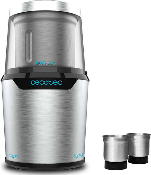 Ηλεκτρικός Μύλος Καφέ 300 W. -2 σε 1 λειτουργίες: Αλέθει και ψιλοκόβει ή πολτοποιεί, απλά τοποθετώντας το κατάλληλο δοχείο. -1ο δοχείο με 2 επίπεδες λεπίδες: Ιδανικό για την άλεση ξηρών συστατικών (πχ. καφές, πιπέρι, μπαχαρικά, σπόροι, αλάτι, κ.α.). -2ο δοχείο με 4 επίπεδες λεπίδες: Κατάλληλο για ψιλοκόψιμο και πολτοποίηση βρεγμένων συστατικών (πχ. ξηροί καρποί, αρωματικά βότανα, σκόρδο, μικρές ποσότητες τζίντζερ, λαχανικών ή κρέατος, κ.α.). -Εξασφαλίζει διαφορετικά επίπεδα αλέσματος και πολτοποίησης ανάλογα με τον χρόνο χρήσης του. -Μηχανισμός ασφαλείας που δεν επιτρέπει την ενεργοποίηση της συσκευής, εάν δεν έχει τοποθετηθεί το καπάκι της. -BPA Free. -Περιλαμβάνονται: Διαφανές καπάκι, βουτσάκι καθαρισμού. Ισχύς: 300 W.Λεπίδες: Με επίστρωση τιτανίου.Υλικό κατασκευής: 100% ανοξείδωτο ατσάλι υψηλής ποιότητας.Χωρητικότητα δοχείου: 90 g.Υλικό κατασκευής: Φινίρισμα από ανοξείδωτο ατσάλι.Διαστάσεις: 11 x 11 x 20 cm.Βάρος: 900 g.Εγγύηση: 2 χρόνια.