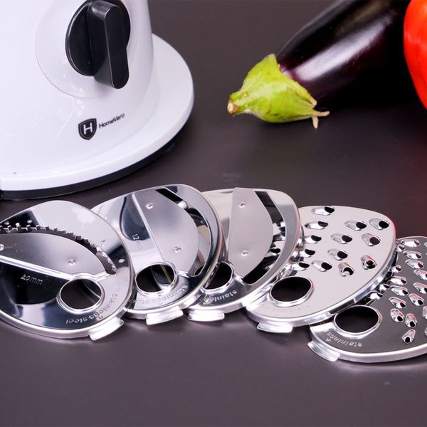 - 6 λεπίδες από ανοξείδωτο ατσάλι για κάθε τύπο κοπής: 1.2mm, 2.4mm, 2mm, 2.8mm julienne, 1mm, 6x8mm