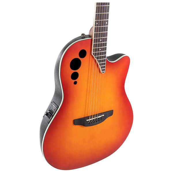 Τα μοντέλα Applause Heritage Elite είναι εξοπλισμένα με καπάκια από επιλεγμένο ξύλο ελάτης. Όπως όλα τα μοντέλα της Elite, διαθέτουν το χαρακτηριστικό Multi Soundholes της Ovation. Αυτή η καινοτόμος κατασκευή χρησιμοποιεί πολλά μικρά ανοίγματα στην άκρη της κορυφής της κιθάρας αντί για μια ενιαία, κεντρική ηχοτρύπα. Αυτό έχει δύο θετικά αποτελέσματα: πρώτον, η διαθέσιμη επιφάνεια δόνησης στο κέντρο του ηχείου αυξάνεται και δεύτερον, ο ήχος βγαίνει πολύ πιο κοντά στο αυτί του ατόμου που παίζει.. Χαρακτηριστικά: - Spruce top, X-Bracing. - Multi Soundhole. - Super Shallow Bowl, Cutaway. - Λαιμός Nato, ταστιέρα και γέφυρα Ovangkol. - Κλίμακα 643mm, πλάτος παξιμαδιού 42,8mm. - Σώμα δέσιμο σε χρώμα ιβουάρ, multi-part purfling. - Diecast machine head, chrome. - Applause Slimline Pickup, CE304T Προενισχυτής με δέκτη. - Εργοστασιακά τοποθετημένες χορδές ADAMAS 1818NU. Χρώμα: Honeyburst.