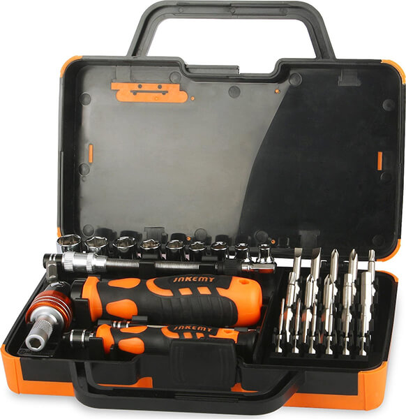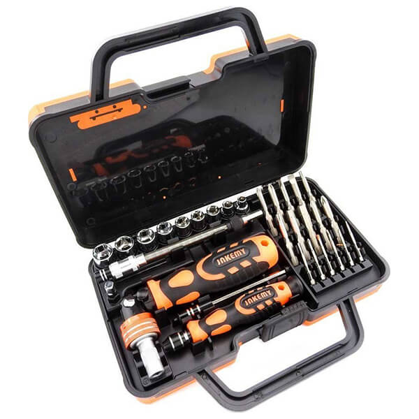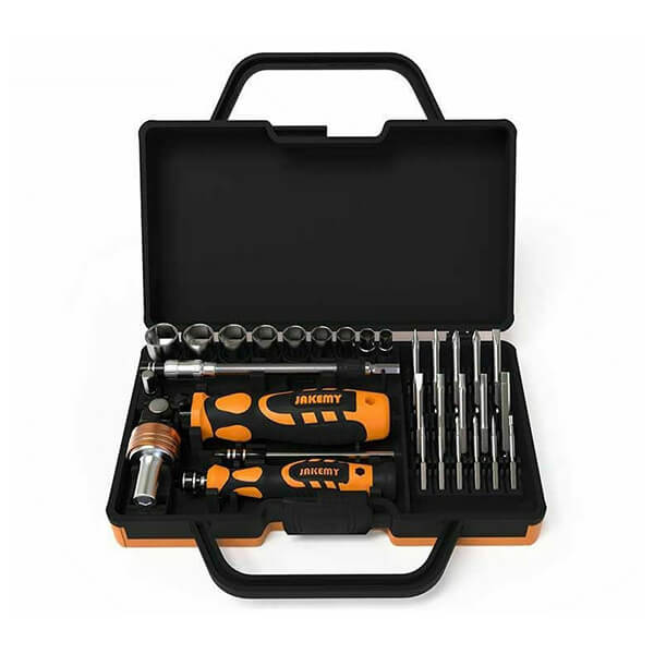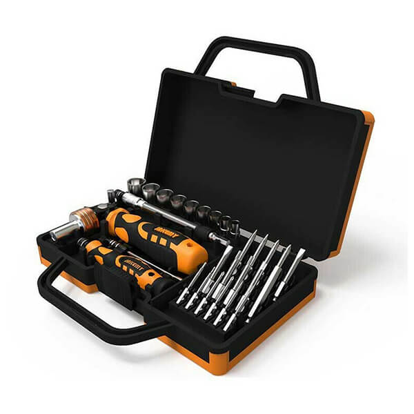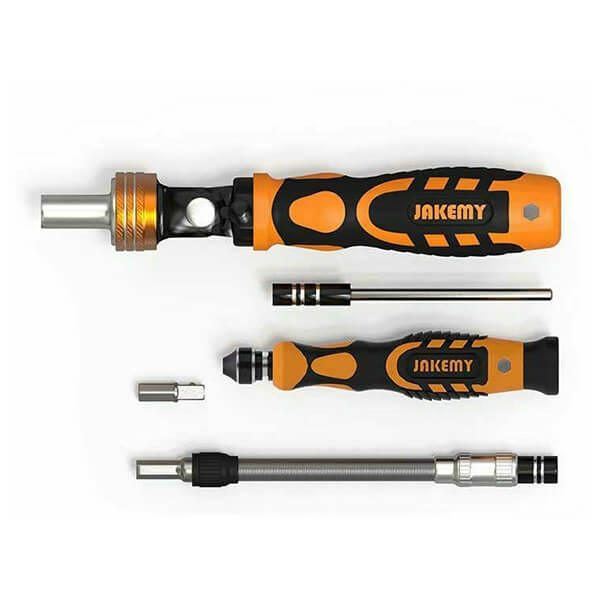 Jakemy Κατσαβίδι με 31 Μαγνητικές Εναλλασσόμενες Μύτες. -Κατασκευασμένο από υλικό υψηλής ποιότητας για να εξασφαλίσει την ασφάλεια, την αξιοπιστία και την αποδοτικότητά του. -Με συμπαγή σχεδιασμό αλλά ταυτόχρονα ελαφρύ, κάτι που το καθιστά εξαιρετικά ανθεκτικό και χρήσιμο. -Με θήκη υψηλής αντοχής που προστατεύει το εσωτερικό από πτώση ή σύγκρουση, ενώ είναι εξοπλισμένο με αντιολισθητική λαβή και μαγνητική κεφαλή επέκτασης, της οποίας το μήκος μπορεί να ρυθμιστεί με βάση διαφορετικές εφαρμογές, είναι εύκολο να αφαιρεθεί και να εγκατασταθεί. -Περιλαμβάνει: Philips: 5.0,6.0,6.5, Slotted: 2.0, Pozi: Pz2,Pz3, Hex: 5.0,6.0, Torx: T9 T10 T15 T20 T25 T30 33310, επέκταση 100mm, επέκταση 150mm. Μέγεθος: 227 x 175 x 54 mm.Τεμάχια: 31 τμχ.Βάρος: 1.1 kg.Εγγύηση: 2 χρόνια.