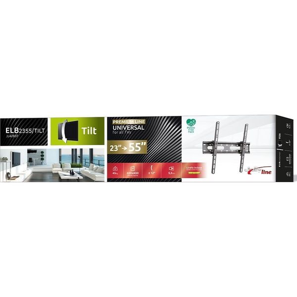 Η ρυθμιζόμενη βάση ELB-2355/TILT JollyLine προορίζεται για στερέωση τηλεόρασης ή οθόνης 23 έως 55 ιντσών (58,42 έως 139,7 cm) και βάρους έως 45 κιλά, σε κάθετη επιφάνεια εσωτερικού χώρου. Ο λειτουργικός σχεδιασμός προσφέρει απόκρυψη της όδευσης του καλωδίου και της ίδιας της βάσης. Με απόσταση μόλις 5,3 εκατοστά από τον τοίχο, είναι ιδανική για περιορισμένους χώρους. Η εγκατάσταση πρέπει να γίνει από εξειδικευμένο τεχνικό και μόνο σε κατάλληλες επιφάνειες στήριξης σύμφωνα με τις προδιαγραφές της βάσης και της συσκευής.