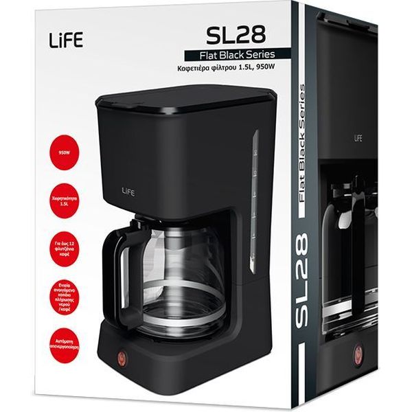 Η καφετιέρα φίλτρου Life SL28 συνδυάζει κομψό σχεδιασμό και πρακτικότητα για την παρασκευή του αγαπημένου σας καφέ. Ιδανική για καθημερινή χρήση στο σπίτι ή το γραφείο, προσφέρει γρήγορη και απολαυστική παρασκευή καφέ φίλτρου. - Αυτόματη απενεργοποίηση μετά από 40 λεπτά άνευ χρήσης, για εξοικονόμηση ενέργειας. - Αποσπώμενο και πλενόμενο φίλτρο καφέ. - Θερμαινόμενη πλάκα που διατηρεί τον καφέ ζεστό. - Ένδειξη στάθμης νερού στο δοχείο. - Λειτουργία anti-drip. - Λειτουργία προστασίας από υπερθέρμανση. Τεχνικά χαρακτηριστικά: Ισχύς: 950W.Χωρητικότητα: 1.5L (έως 12 φλιτζάνια).Τροφοδοσία: 220-240V~, 50-60Hz.Χρώμα: Μαύρο.Διαστάσεις: 240 x 170 x 325 mm.Εγγύηση: 2 χρόνια.