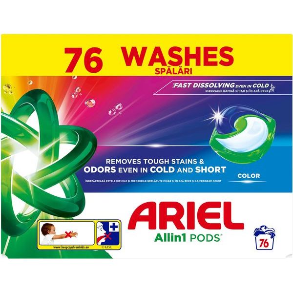 Ariel All-in-1 Καψουλές για Χρωματιστά Ρούχα (76 τεμάχια) Οι κάψουλες Ariel All-in-1 για χρωματιστά ρούχα προσφέρουν απόλυτη δύναμη καθαρισμού χωρίς κόπο. Κάθε κάψουλα διαθέτει πολλαπλά διαμερίσματα που κρατούν τα ενεργά συστατικά ξεχωριστά μέχρι να ξεκινήσει η πλύση, εξασφαλίζοντας ότι κάθε λεκές αντιμετωπίζεται με τη σωστή δράση. Διαλύονται εύκολα ακόμη και σε κρύα νερά, προσφέρουν διαχρονική προστασία του χρώματος και αφήνουν τα ρούχα φρεσκάδα και ζωντάνια πλυση με πλύση. Το πακέτο με 76 κάψουλες είναι πρακτικό και συμφέρει για τακτική χρήση. - Ισχυρή δράση κατά των λεκέδων: Κάθε διαμέρισμα στην κάψουλα ενεργοποιείται σωστά ώστε να απομακρύνει ακόμα και επίμονους λεκέδες.