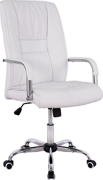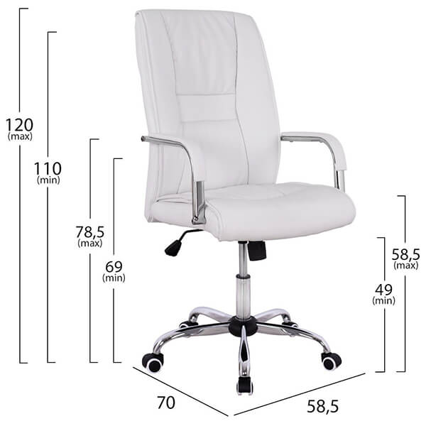 Καρέκλα γραφείου διευθυντική με μπράτσα και ανάκλιση από υψηλής ποιότητας PU σε λευκό χρώμα και μοναδικό design. -Μπράτσα και βάση μεταλλικά ενισχυμένα βαρέως τύπου επιχρωμιωμένα. -Ροδάκια ενισχυμένα. -Κάθισμα και πλάτη ανατομικά με διπλά μαξιλαράκια στήριξης.br>-Ιδανική για αυτούς που κάθονται αρκετές ώρες μπροστά στον υπολογιστή. Χαρακτηριστικά: Διαστάσεις: 58.5 x 70 x 110-120 εκ.Ύψος καθίσματος: 49 εκ./58.5 εκ.Ύψος μπράτσων: 69 εκ./78.5 εκ.Διαστάσεις καθίσματος: 50 x 50 εκ.Χρώμα: Λευκό.Εγγύηση: 2 χρόνια. DOA 7 ημερών