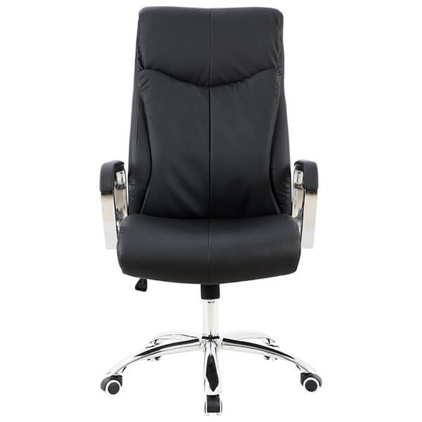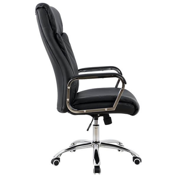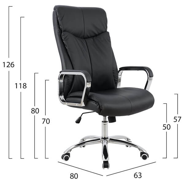 Καρέκλα γραφείου διευθυντική, με μπράτσα και ανάκλιση, από υψηλής ποιότητας PU σε μαύρο χρώμα και μοναδικό design. -Μπράτσα μεταλλικά ενισχυμένα βαρέως τύπου επιχρωμιωμένα. -Βάση μεταλλική επιχρωμιωμένη και ενισχυμένα ροδάκια. -Κάθισμα και πλάτη ανατομικά με διπλό μαξιλάρι. -Ιδανική για αυτούς που κάθονται αρκετές ώρες μπροστά στον υπολογιστή. Χαρακτηριστικά: Διαστάσεις: 63 x 80 x 118-126 εκ.Διαστάσεις καθίσματος: 56 x 56 εκ.Ύψος καθίσματος: 50 εκ./57 εκ.Ύψος Μπράτσων: 70 εκ./80 εκ.Χρώμα: Μαύρο.Εγγύηση: 2 χρόνια. DOA 7 ημερών