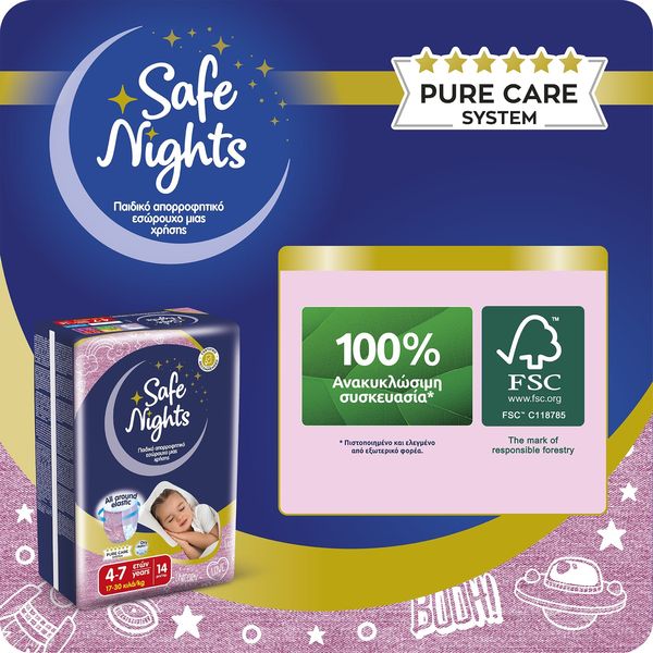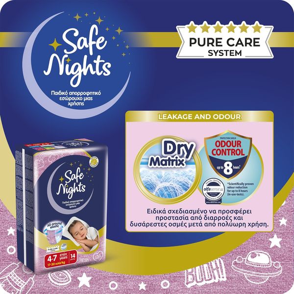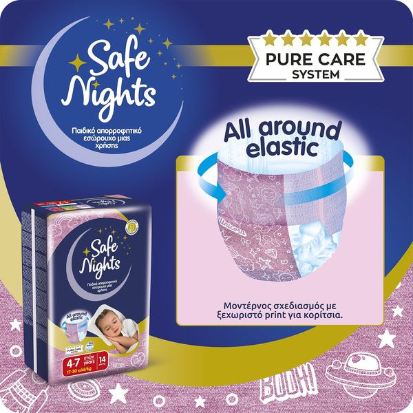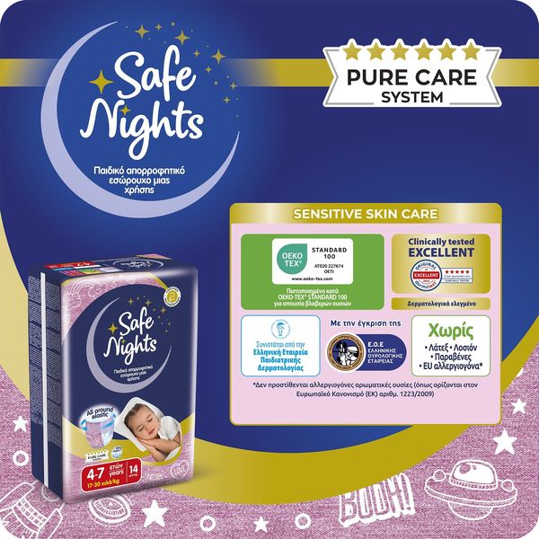 Ôï ðñïúüí åìðßðôåé óôçí êáôçãïñßá ìçäåíéêïý Ö.Ð.Á óýìöùíá ìå ôï äéÜôáãìá (ÊÄÐ 349/2024) áðü 4 Íïåìâñßïõ 2024 ìÝ÷ñé 31 Äåêåìâñßïõ 2026. Ôá åëáóôéêÜ áðïññïöçôéêÜ åóþñïõ÷á ìéáò ÷ñÞóçò, âïçèïýí áðïôåëåóìáôéêÜ óôçí ðñïóôáóßá áðï áôõ÷Þìáôá íõ÷ôåñéíÞò åíïýñçóçò, óõìâÜëëïíôáò óå Ýíáí Üíåôï ýðíï ôç íý÷ôá, ÷áñßæïíôáò óôá ðáéäéÜ Üíåóç êáé áõôïðåðïßèçóç. Åßíáé åéäéêÜ ó÷åäéáóìÝíá ãéá áãüñéá ìåôáîý 4-10 åôþí ìå âÜóç ôï Óýóôçìá ÁãíÞò Öñïíôßäáò Pure Care System, ðïõ áðïôõðþíåé üëï ôï Óýóôçìá åëÝã÷ùí, ðéóôïðïéÞóåùí êáé áõóôçñþí äéáäéêáóéþí äéáóöÜëéóçò ðïéüôçôáò ðßóù áðü ôçí ðáñáãùãÞ ôïõò. Áðïññïöïýí Üìåóá ôçí õãñáóßá, äéáôçñþíôáò ôçí åõáßóèçôç ðåñéï÷Þ óôåãíÞ êáé õãéåéíÜ êáèáñÞ. ËåðôÜ êáé äéáêñéôÜ ìå ó÷åäéáóìü “all around elastic", ðïõ åöáñìüæåé óáí êáíïíéêü åóþñïõ÷á.