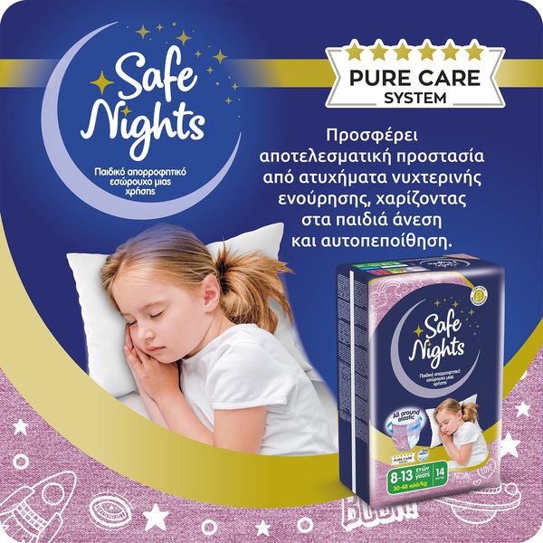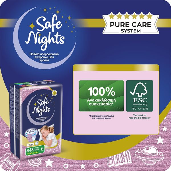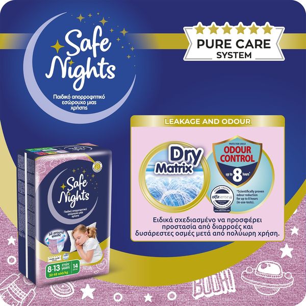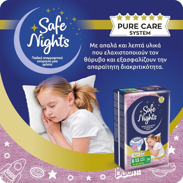 Ôï ðñïúüí åìðßðôåé óôçí êáôçãïñßá ìçäåíéêïý Ö.Ð.Á óýìöùíá ìå ôï äéÜôáãìá (ÊÄÐ 349/2024) áðü 4 Íïåìâñßïõ 2024 ìÝ÷ñé 31 Äåêåìâñßïõ 2026. Ôá åëáóôéêÜ áðïññïöçôéêÜ åóþñïõ÷á ìéáò ÷ñÞóçò, âïçèïýí áðïôåëåóìáôéêÜ óôçí ðñïóôáóßá áðï áôõ÷Þìáôá íõ÷ôåñéíÞò åíïýñçóçò, óõìâÜëëïíôáò óå Ýíáí Üíåôï ýðíï ôç íý÷ôá, ÷áñßæïíôáò óôá ðáéäéÜ Üíåóç êáé áõôïðåðïßèçóç. Åßíáé åéäéêÜ ó÷åäéáóìÝíá ãéá áãüñéá ìåôáîý 4-10 åôþí ìå âÜóç ôï Óýóôçìá ÁãíÞò Öñïíôßäáò Pure Care System, ðïõ áðïôõðþíåé üëï ôï Óýóôçìá åëÝã÷ùí, ðéóôïðïéÞóåùí êáé áõóôçñþí äéáäéêáóéþí äéáóöÜëéóçò ðïéüôçôáò ðßóù áðü ôçí ðáñáãùãÞ ôïõò. Áðïññïöïýí Üìåóá ôçí õãñáóßá, äéáôçñþíôáò ôçí åõáßóèçôç ðåñéï÷Þ óôåãíÞ êáé õãéåéíÜ êáèáñÞ. ËåðôÜ êáé äéáêñéôÜ ìå ó÷åäéáóìü “all around elastic", ðïõ åöáñìüæåé óáí êáíïíéêü åóþñïõ÷á.