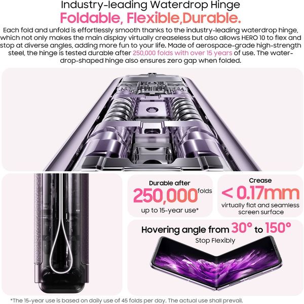 Το Blackview HERO 10 προσφέρει έναν μοναδικό συνδυασμό λειτουργικότητας και στυλ με τις δύο οθόνες του: μία κύρια AMOLED 6,9 2.5K και μία εξωτερική OLED 1,19 για άμεση πρόσβαση στις ειδοποιήσεις. Το λεπτό και ελαφρύ σώμα του (198g, 8,08mm ανοιχτό) συνοδεύεται από premium κατασκευή με vegan δέρμα και αλουμίνιο αεροδιαστημικής, ενώ ο μηχανισμός Waterdrop εξασφαλίζει αντοχή έως 250.000 αναδιπλώσεις χωρίς ορατά τσακίσματα.