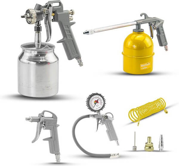 Περιλαμβάνει: Πιστόλι βαφής άνω δοχείο, Πετρελιέρα, Αερόμετρο απλό, Σωλήνα σπιράλ, Πιστόλι αέρος.