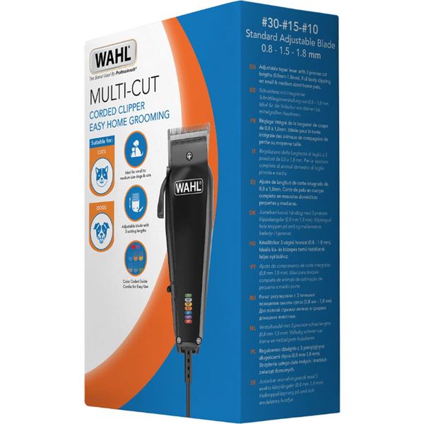 Η κουρευτική μηχανή ρεύματος Multi-Cut της WAHL διαθέτει πανίσχυρο μοτέρ 7.200 στροφών/λεπτό, προσφέροντας υψηλή απόδοση, ακρίβεια και σταθερή ισχύ σε κάθε χρήση. Είναι εξοπλισμένη με λεπίδες (#30-15-10 ) από ανθρακούχο ατσάλι, οι οποίες είναι αυτοακονιζόμενες και ανθεκτικές στη σκουριά και τη διάβρωση. Με πλάτος κοπής 46 mm, μήκος κοπής 0.8-1.8 mm και 7 χτενάκια-οδηγούς με χρωματική ένδειξη (3-22 mm), προσφέρει ευελιξία και ακρίβεια. Είναι κατάλληλη για μικρού και μεσαίου μεγέθους σκύλους και γάτες, ενώ η εργονομική κατασκευή και η αθόρυβη λειτουργία (67 dB) εξασφαλίζουν μία άνετη και ξεκούραστη εμπειρία περιποίησης.