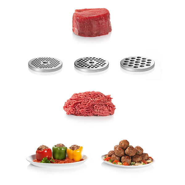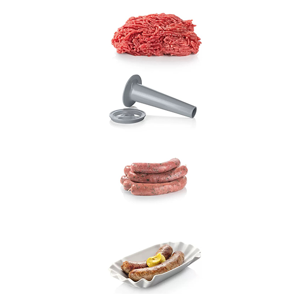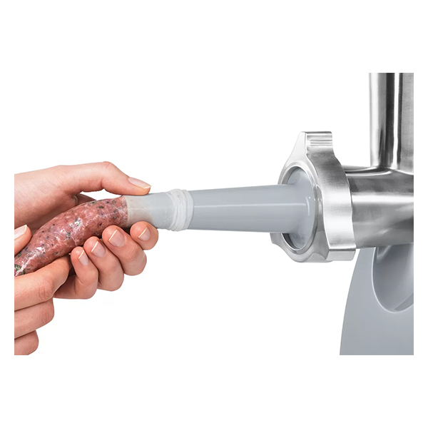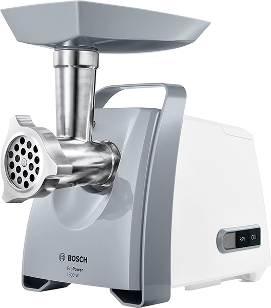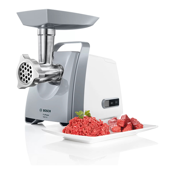 Κρεατομηχανή BOSCH MFW66020. Χαρακτηριστικά: - Κατά την άλεση πολύ σκληρών υλικών, μία κρεατομηχανή μπορεί να κολλήσει. Σε μια τέτοια περίπτωση χρειάζεστε τη λειτουργία αντίστροφης κίνησης η οποία σας βοηθάει να απελευθερώσετε υλικά που έχουν κολλήσει. Χάρη σε αυτή τη λειτουργία, η κρεατομηχανή είναι έτοιμη για χρήση ξανά πολύ γρήγορα. - Τα σπιτικά λουκάνικα μπορούν να προετοιμαστούν φρέσκα υλικά που επιλέγετε εσείς ανάλογα με τις προτιμήσεις σας και να ικανοποιήσουν γευστικά τους καλεσμένους σας. Το ειδικό εξάρτημα για λουκάνικα σας επιτρέπει να δημιουργήσετε τα δικά σας πεντανόστιμα λουκάνικα, από κοτόπουλο, μοσχαρίσιο ή χοιρινό κρέας, ή και με χορτοφαγικά υλικά. - Μπορείτε να φτιάξετε σπιτικά γεμιστά λουκάνικα ακόμα και αν δεν έχετε πολύ χρόνο. Το εξάρτημα αυτό είναι σχεδιασμένο για να κάνει την διαδικασία πιο εύκολη: ετοιμάζετε εύκολα το 'σωλήνα' με τα υλικά της επιλογής σας και τον γεμίζετε με λαχταριστό τυρί ή ό,τι άλλο επιθυμείτε. - Μία κρεατομηχανή που κουνιέται δεν είναι ασφαλής. Χάρη στα λαστιχένια ποδαράκια η κρεατομηχανή παραμένει σταθερή στη θέση της ακόμα και κατά τη χρήση. - Δεν χρειάζεται να αναζητάτε τους δίσκους του πολυκόπτη στα ντουλάπια της κουζίνας σας. Η κρεατομηχανή έχει σχεδιαστεί ώστε δίσκοι να μπορούν να αποθηκευτούν άνετα στον ενσωματωμένο αποθηκευτικό χώρο για να τα έχετε όλα οργανωμένα στην εντέλεια. - Με την πρακτική χειρολαβή μεταφοράς, μπορείτε εύκολα και με ασφάλεια να μετακινείτε την κρεατομηχανή όπου εσείς επιθυμείτε, ή να την αποθηκεύσετε εύκολα στο ντουλάπι. Ισχύς: 1800 W.Τροφοδοσία: 50-60 Hz, 220-240 V.Χρώμα: Λευκό/Γκρί.Εγγύηση: 2 χρόνια.