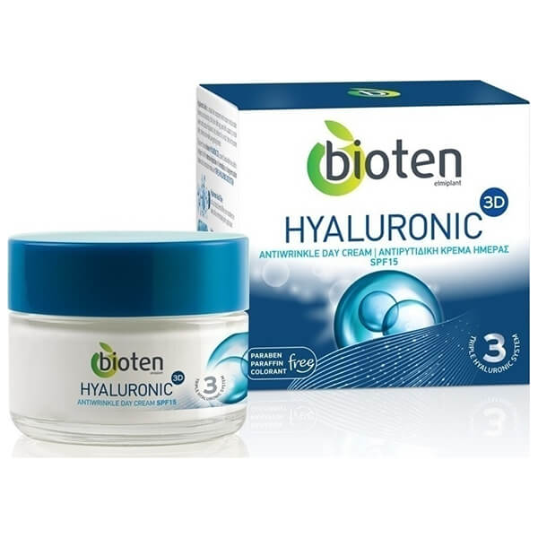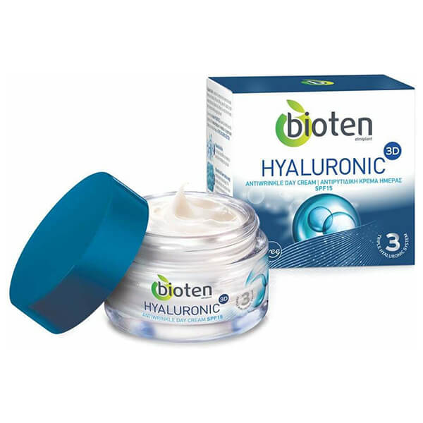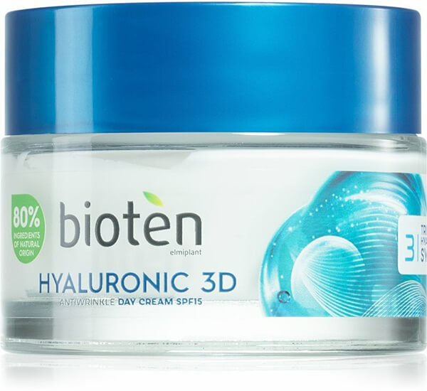 Αντιρυτιδική κρέμα ημέρας Bioten Hyaluronic με ΜΕ SPF15 σχεδιασμένη να προσφέρει εντατική ενυδάτωση με άμεση και μακροχρόνια δράση, χάρη στο τριπλό σύστημα υαλουρονικού οξέως που διαθέτει. Έχει κλινικά αποδεδειγμένη αποτελεσματικότητα, καθώς προσφέρει άμεσα λεία και σφριγηλή επιδερμίδα, ενώ μετά από ένα μήνα χρήσης, μείωση των ρυτίδων έως 24% και ορατή βελτίωση της ελαστικότητας και της λάμψης του δέρματος κατά 90%. Κατάλληλη για γυναίκες από 35 έως 45 ετών.