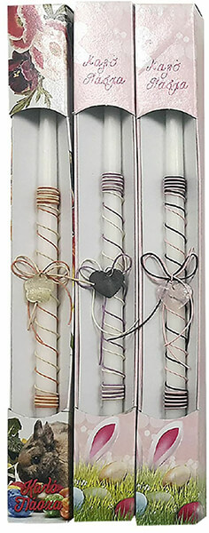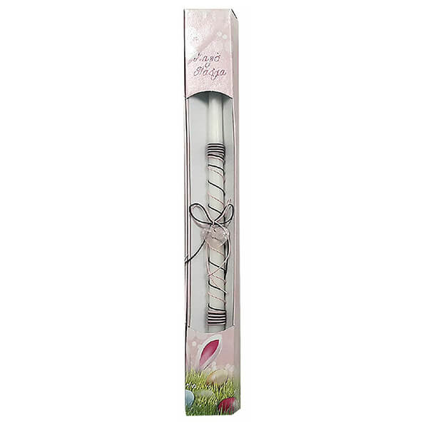 Πασχαλινή λαμπάδα με κορδόνι και στολίδι καρδιά σε χρωματιστό κουτί.