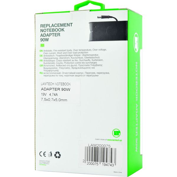 > LAMTECH NOTEBOOK ADAPTER 90W HP 19V4,74A 7,5X0,7X5,0MM LAM200075