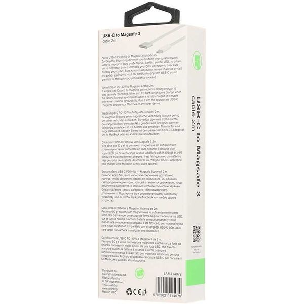 Ανακαλύψτε το USB-C PD140W σε Magsafe 3 καλώδιο 2μ., το απόλυτο αξεσουάρ φόρτισης για το MacBook σας ή άλλες συμβατές συσκευές. Με τη μαγνητική σύνδεση που εξασφαλίζει σταθερότητα, θα παραμείνει συνδεδεμένο με ασφάλεια, ενώ το φωτάκι LED ενδείκνει την κατάσταση φόρτισης: πορτοκαλί όταν φορτίζει και πράσινο όταν είναι πλήρως φορτισμένο.