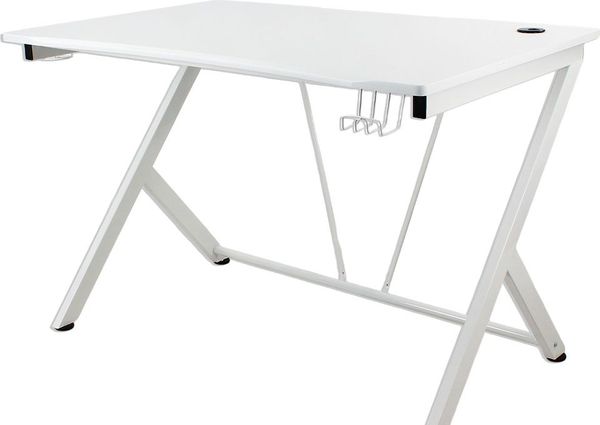IQ: White gaming desk with ergonomic design, durable MDF surface, steel legs, and integrated accessories for organized and comfortable use.