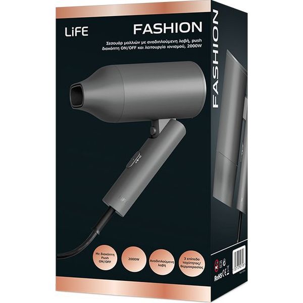 Το σεσουάρ LiFE FASHION συνδυάζει πρακτικότητα, ισχυρή απόδοση και κομψό σχεδιασμό, αποτελώντας ιδανική επιλογή τόσο για χρήση σε ξενοδοχεία όσο και για ταξίδια. Η αναδιπλούμενη λαβή του επιτρέπει πανεύκολη αποθήκευση σε συρτάρι ή βαλίτσα, ενώ το δυνατό DC μοτέρ των 2000W εξασφαλίζει ισχυρή ροή αέρα για γρήγορο και αποδοτικό στέγνωμα. Ο push διακόπτης ON/OFF προσφέρει απόλυτη ασφάλεια, αφού το σεσουάρ λειτουργεί μόνο όσο παραμένει πατημένος, μειώνοντας ταυτόχρονα την κατανάλωση ενέργειας. Με 2 ρυθμίσεις ταχύτητας και θερμοκρασίας, μαζί με λειτουργία cool shot, μπορείς να διαμορφώσεις το styling σου με ακρίβεια και να το σταθεροποιήσεις εύκολα. Η τεχνολογία ιονισμού συμβάλλει στην εξάλειψη του φριζαρίσματος και στη διατήρηση της φυσικής λάμψης των μαλλιών, ενώ το αποσπώμενο φίλτρο εισαγωγής αέρα διευκολύνει τον καθαρισμό και την καλή μακροχρόνια απόδοση της συσκευής. Διαθέτει επίσης αποσπώμενο στόμιο και καλώδιο μήκους περίπου 1.6m, προσφέροντας άνεση στη χρήση. - Επίπεδα ταχύτητας / θερμοκρασίας: 3