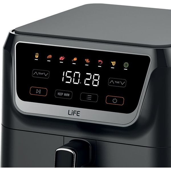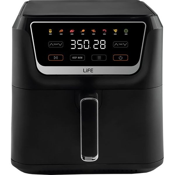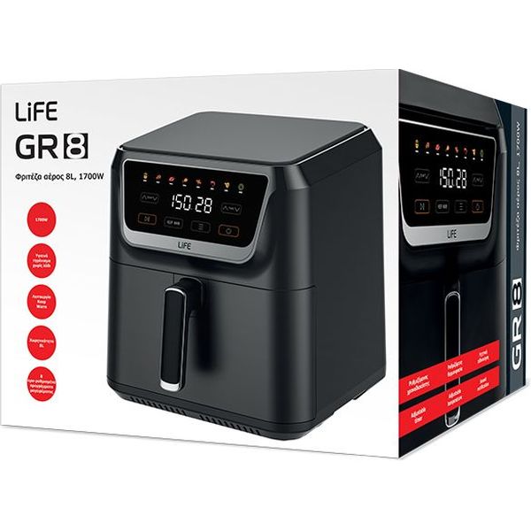 Η LiFE GR8 είναι η απόλυτη φριτέζα αέρος που σας επιτρέπει να μαγειρεύετε γρήγορα, υγιεινά και με ελάχιστη ή καθόλου χρήση λαδιού. Με ισχύ 1700W και μεγάλο αποσπώμενο κάδο 8L, εξασφαλίζει τραγανή υφή στα φαγητά, χωρίς τις θερμίδες του παραδοσιακού τηγανίσματος. Διαθέτει 8 προγράμματα μαγειρέματος για ποικιλία γευμάτων, ενώ η δυνατότητα ρύθμισης θερμοκρασίας και χρόνου μαγειρέματος προσφέρει απόλυτη ευελιξία. Με τη λειτουργία Keep Warm, διατηρεί το φαγητό σας ζεστό, ενώ ο αποσπώμενος κάδος με αντικολλητική επίστρωση καθαρίζεται εύκολα και πλένεται στο πλυντήριο πιάτων. Η LiFE GR8 είναι ασφαλής στη χρήση χάρη στο θερμομονωμένο εξωτερικό περίβλημα, τα αντιολισθητικά πέλματα και την προστασία υπερθέρμανσης. - Λειτουργία: Ζεστού αέρα για υγιεινό μαγείρεμα με ελάχιστο λάδι