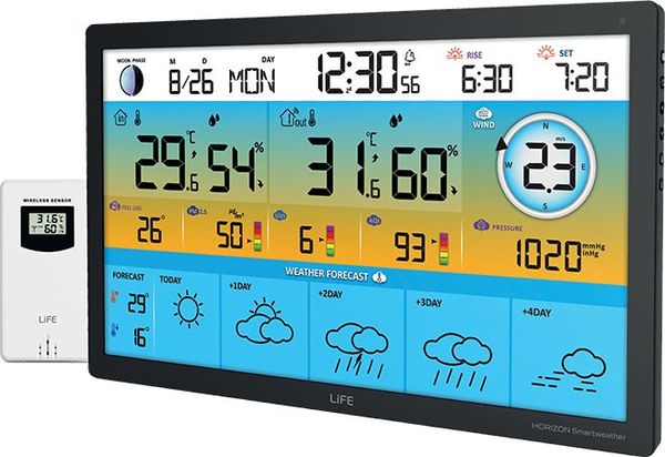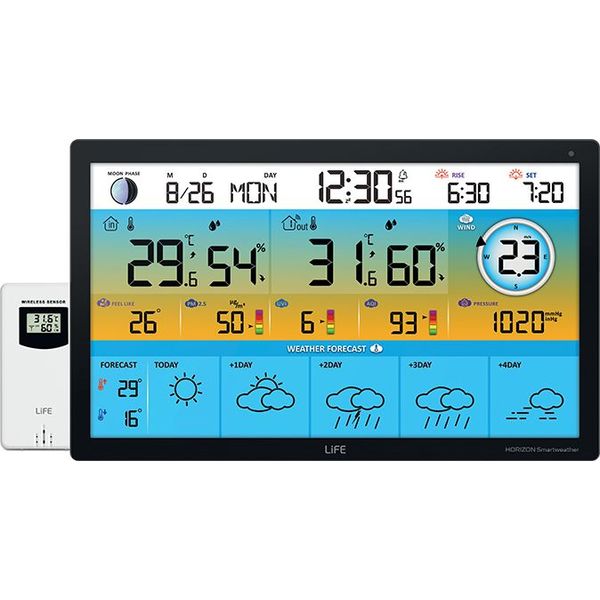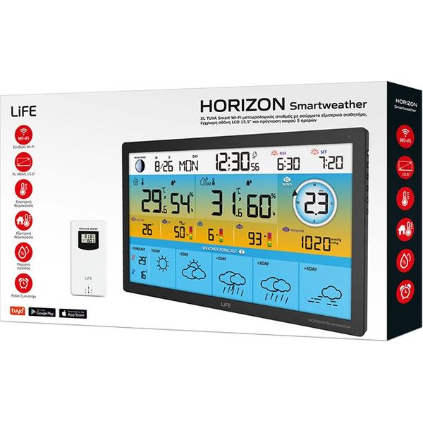 Ο μετεωρολογικός σταθμός LiFE HORIZON SmartWeather TUYA XL είναι ένας πλήρως έξυπνος Wi-Fi σταθμός με ασύρματο εξωτερικό αισθητήρα θερμοκρασίας και εντυπωσιακή έγχρωμη LCD οθόνη 15.5, προσφέροντας ολοκληρωμένη ενημέρωση για τις καιρικές συνθήκες, τόσο τοπικά όσο και μέσω διαδικτύου. Με πρόγνωση καιρού 5 ημερών, ένδειξη ποιότητας αέρα και πλήρη καταγραφή θερμοκρασίας και υγρασίας, αποτελεί ένα προηγμένο εργαλείο για κάθε σύγχρονο σπίτι.