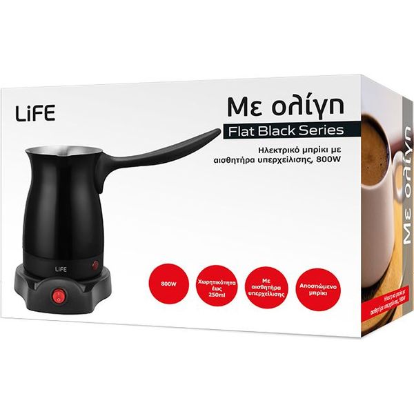 Το ηλεκτρικό μπρίκι LIFE "Με Ολίγη" της σειράς Flat Black συνδυάζει κομψό design και πρακτικότητα, προσφέροντας εύκολη και γρήγορη παρασκευή ελληνικού καφέ. Με ισχύ 800W και αισθητήρα υπερχείλισης, εξασφαλίζει ασφαλή και άνετη χρήση.