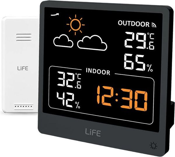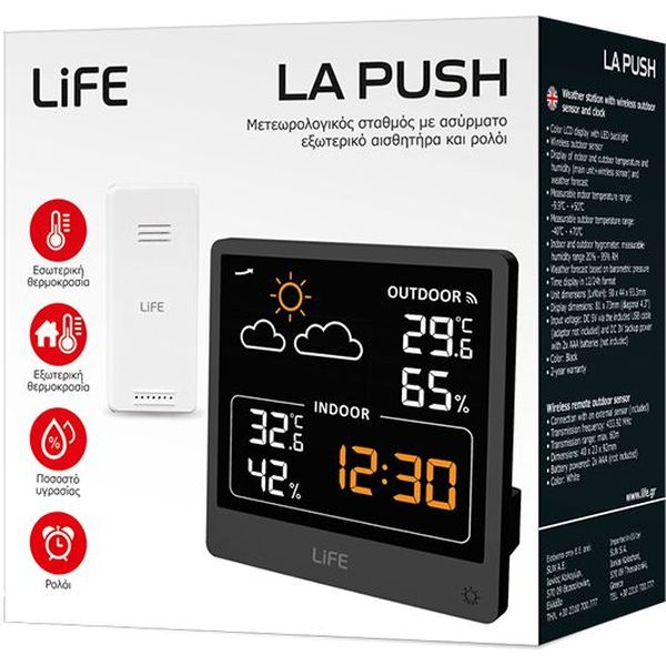 Ο μετεωρολογικός σταθμός LiFE LA PUSH είναι μια ολοκληρωμένη λύση για την παρακολούθηση των καιρικών συνθηκών εντός και εκτός σπιτιού. Διαθέτει έγχρωμη LCD οθόνη 4.3 με LED οπίσθιο φωτισμό, παρέχοντας ευκρινή προβολή θερμοκρασίας, υγρασίας, ώρας και πρόγνωσης καιρού μέσω 6 εικονιδίων, βασισμένων στη βαρομετρική πίεση. Η συσκευή συνοδεύεται από ασύρματο εξωτερικό αισθητήρα, επιτρέποντάς σας να έχετε πλήρη εικόνα για το μικροκλίμα του χώρου σας. Ο σταθμός προβάλλει τόσο τις εσωτερικές όσο και τις εξωτερικές μετρήσεις θερμοκρασίας και υγρασίας, ενώ εμφανίζει τις ημερήσιες υψηλότερες και χαμηλότερες τιμές για άμεση ενημέρωση. Η λειτουργία ρολογιού σε μορφή 12/24h προσφέρει πρακτικότητα, ενσωματωμένη στην καθαρή διάταξη της οθόνης. Η μονάδα τροφοδοτείται μέσω USB Type-C με το παρεχόμενο καλώδιο, ενώ υπάρχει και δυνατότητα τοποθέτησης 2xAAA μπαταριών για εφεδρική λειτουργία, ώστε να μη χάνονται οι ρυθμίσεις μετά από διακοπή ρεύματος. Όταν λειτουργεί μέσω USB, μπορείτε να ρυθμίσετε την ένταση του οπίσθιου φωτισμού με το αντίστοιχο πλήκτρο. Ο εξωτερικός αισθητήρας προσφέρει αξιόπιστη σύνδεση με συχνότητα 433.92 MHz και μέγιστη εμβέλεια έως 60 μέτρα. Είναι συμβατός με τον αισθητήρα LiFE WSS2 και λειτουργεί επίσης με 2xAAA μπαταρίες. Οι συμπαγείς διαστάσεις τόσο της κύριας μονάδας όσο και του αισθητήρα επιτρέπουν εύκολη τοποθέτηση σε κάθε σημείο του σπιτιού. - Έγχρωμη LCD οθόνη 4.3 με LED φωτισμό