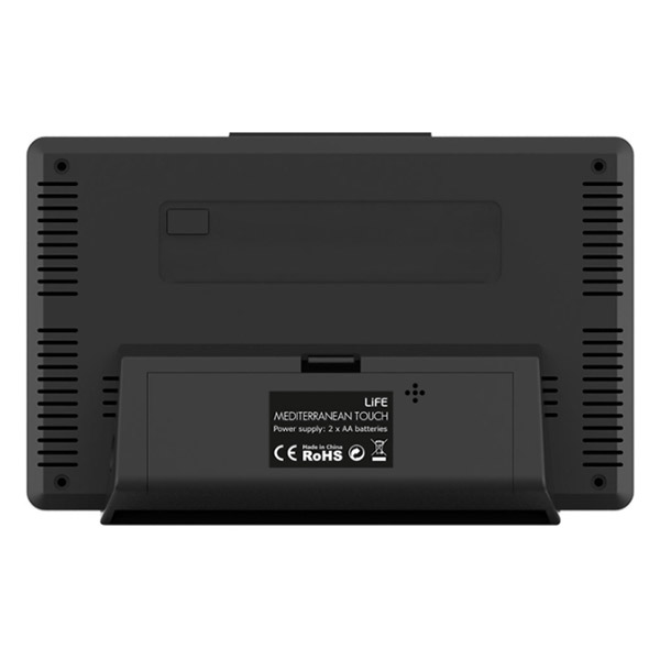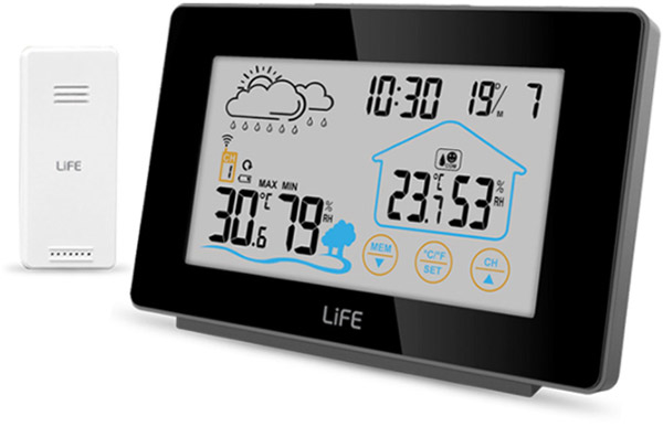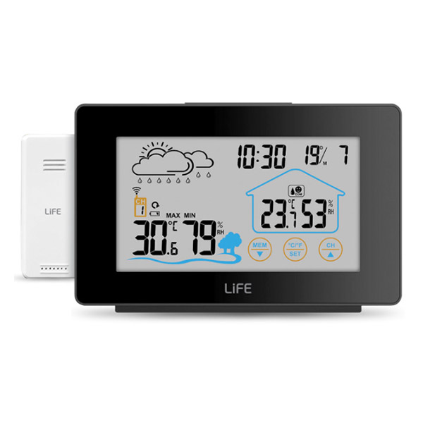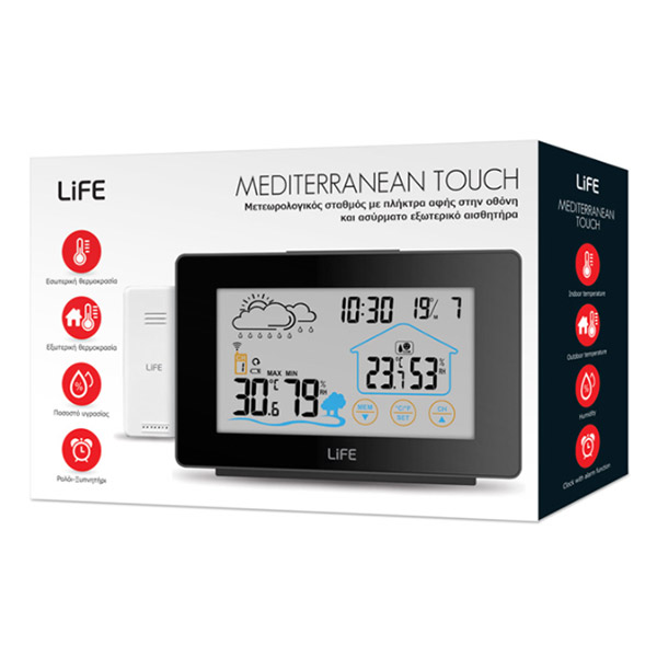Μετεωρολογικός σταθμός με οθόνη LCD 5", πλήκτρα αφής και οπίσθιο λευκό φωτισμό LED, ασύρματη εξωτερική μονάδα και λειτουργία ρολογιού / ξυπνητηριού. Προβάλλει θερμοκρασία εσωτερικού και εξωτερικού χώρου καθώς και υγρασία εσωτερικού / εξωτερικου χώρου. Διαθέτει επιπλέον ένδειξη ημερήσιας υψηλότερης/χαμηλότερης θερμοκρασίας, πρόβλεψη καιρού με γραφική απεικόνιση και ένδειξη ώρας.