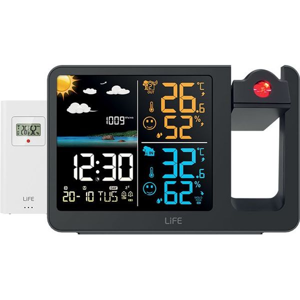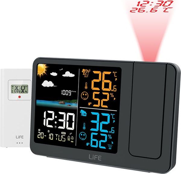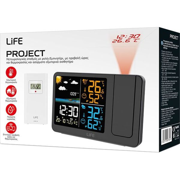Ο μετεωρολογικός σταθμός LiFE PROJECT διαθέτει μεγάλη, ψηφιακή LCD οθόνη και ασύρματο εξωτερικό αισθητήρα για αξιόπιστη ενημέρωση των καιρικών συνθηκών στον χώρο σας, ενώ η λειτουργία προβολής ώρας και θερμοκρασίας στο ταβάνι ή στον τοίχο προσφέρει απόλυτη ευκολία, ειδικά στο υπνοδωμάτιο.