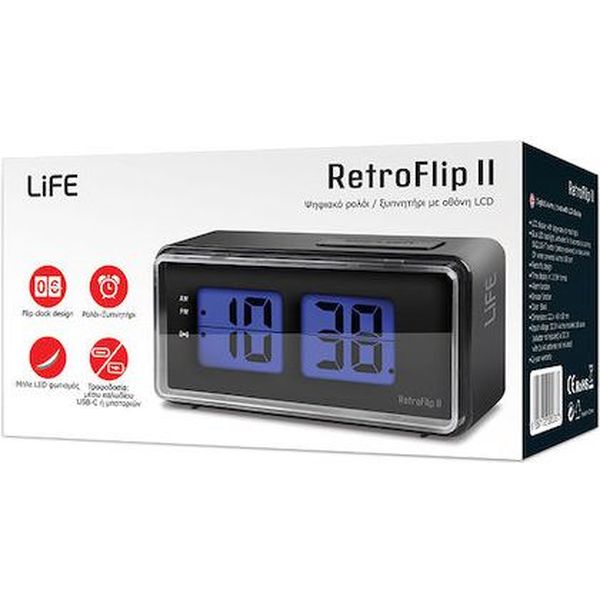 Ξεκινήστε τη μέρα σας με στυλ με το ψηφιακό ρολόι / ξυπνητήρι LIFE RetroFlip II! Διαθέτει LCD οθόνη με μεγάλα ευανάγνωστα ψηφία και ιδιαίτερο retro flip design, συνδυάζοντας πρακτικότητα και αισθητική. Ο μπλε LED οπίσθιος φωτισμός ενεργοποιείται για 8 δευτερόλεπτα με το πάτημα του πλήκτρου SNZ/LIGHT όταν λειτουργεί με μπαταρίες ή παραμένει διαρκώς ανοιχτός με τροφοδοσία μέσω USB Type-C. Η δυνατότητα επιλογής φωτισμού σας επιτρέπει να κοιμάστε χωρίς φως ή να βλέπετε εύκολα την ώρα ακόμα και στο σκοτάδι. Επιπλέον, η λειτουργία snooze σας προσφέρει την επιλογή να αναβάλετε το ξυπνητήρι και να απολαύσετε λίγα λεπτά ύπνου παραπάνω. - Οθόνη: LCD με μεγάλα ευανάγνωστα ψηφία