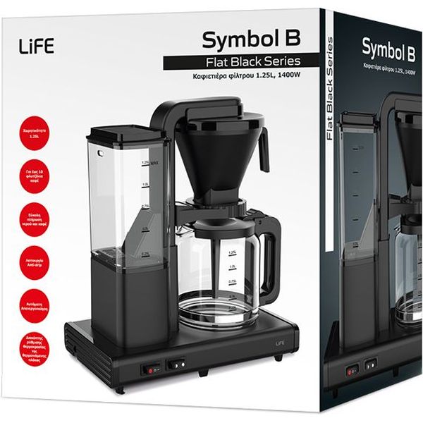 Η καφετιέρα φίλτρου LiFE SYMBOL B της σειράς Flat Black φέρνει στην κουζίνα σου έναν συνδυασμό υψηλής αισθητικής και πρακτικότητας. Με μοντέρνο design σε ματ μαύρο χρώμα και ισχύ 1400W, αποτελεί ιδανική επιλογή για όσους θέλουν άψογο καφέ και κομψό στιλ στον πάγκο τους.