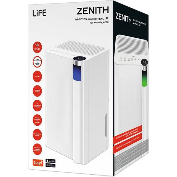 Ο αφυγραντήρας LiFE ZENITH 12L με ιονιστή αέρα και σύνδεση Wi-Fi μέσω Tuya συνδυάζει σύγχρονη τεχνολογία και υψηλή απόδοση για ιδανικό κλίμα στο σπίτι. Με χωρητικότητα αφύγρανσης έως 12 λίτρα/24h, απομακρύνει την υγρασία αποτελεσματικά σε χώρους έως 60m², ενώ ο ενσωματωμένος ιονιστής καθαρίζει τον αέρα εξουδετερώνοντας μικροσωματίδια και δυσάρεστες οσμές. Μέσα από την εφαρμογή Tuya μπορείς να ελέγχεις εξ αποστάσεως όλες τις ρυθμίσεις του, ενώ το LED πάνελ προσφέρει εύκολη παρακολούθηση του επιπέδου υγρασίας. Με 2 ταχύτητες, 3 προγράμματα λειτουργίας, αυτόματη απόψυξη και χαμηλό θόρυβο ?38dB(A), εξασφαλίζει άνεση και ησυχία σε κάθε χώρο. Ο LiFE ZENITH διαθέτει δοχείο 2L, χρονοδιακόπτη 24 ωρών, ροδάκια και λαβή για εύκολη μετακίνηση, καθώς και λειτουργία αυτόματης επανεκκίνησης σε περίπτωση διακοπής ρεύματος. - Απόδοση αφύγρανσης: έως 12L/24h