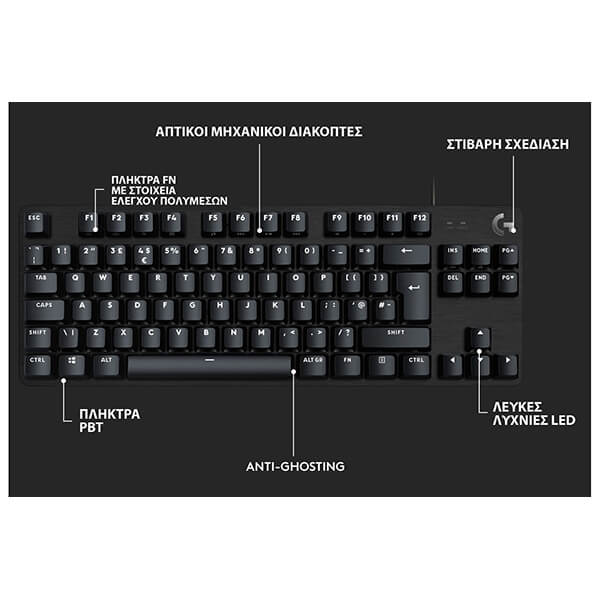 Το G413 TKL SE διαθέτει απτικούς μηχανικούς διακόπτες, ταυτόχρονη πληκτρολόγηση 6 πλήκτρων με δυνατότητα anti-ghosting, πλήκτρα PBT και ανθεκτική κατασκευή από κράμα αλουμινίουόλα σε μια σχεδίαση χωρίς αριθμητικό πληκτρολόγιο. Απτικοί μηχανικοί διακόπτες. Το G413 TKL SE παρέχεται χωρίς αριθμητικό πληκτρολόγιο για μέγιστη απόδοση. Οι απτικοί μηχανικοί διακόπτες κατηγορίας παιχνιδιών παρέχουν ομαλή ανάδραση κατά την ενεργοποίηση και είναι ιδανικοί για άμεσες αποφάσεις σε παιχνίδια ανταγωνιστικά και FPS. Πλήκτρα PBT. Τα ανθεκτικά πλήκτρα έχουν καθοριστικό ρόλο στη διατήρηση της αυτοπεποίθησης σε όλα σας τα πατήματα. Τα πλήκτρα είναι κατασκευασμένα από PBTτο πιο ανθεκτικό υλικό της αγοράς. Το PBT παρέχει εξαιρετική ανθεκτικότητα στη θερμότητα και τη φθορά για βέλτιστη απόδοση στα παιχνίδια καθ' όλη τη διάρκεια ζωής του πληκτρολογίου σας. Φωτισμός LED. Είτε παίζετε ανταγωνιστικά, είτε παίζετε με φίλους, η συγκέντρωση είναι απαραίτητη. Το G413 TKL SE διαθέτει λευκό φωτισμό LED που έχει σχεδιαστεί με μεγάλη προσοχή ώστε να ενισχύει την συγκέντρωση και την ευκρίνεια. Ταυτόχρονη χρήση 6 πλήκτρων με anti-ghost. Η ταυτόχρονη χρήση 6 πλήκτρων με πίνακα παιχνιδιών anti-ghosting παρέχει πλήρη έλεγχο στο αποκορύφωμα του παιχνιδιού. Πιέστε απρόσκοπτα πολλά πλήκτρα ταυτόχρονα. Σχεδιασμένο για να αντέχει. Το G413 TKL SE διαθέτει επάνω περίβλημα από εξαιρετικής ποιότητας μαύρο, βουρτσισμένο κράμα αλουμινίου 5052, χαμηλών εκπομπών διοξειδίου του άνθρακα, μηχανικούς διακόπτες κατηγορίας παιχνιδιών και πλήκτρα PBT για κορυφαία εμπειρία και ανώτερη ανθεκτικότητα. Χαρακτηριστικά Απόσταση ενεργοποίησης: 1,9 mm.Ισχύς ενεργοποίησης: 50 g.Τύπος σύνδεσης: USB 2.0.Συμβατότητα: Windows 10 ή μετέπειτα εκδόσεις, macOS X 10.14 ή μετέπειτα εκδόσεις.Οπίσθιος φωτισμός: λευκός φωτισμός.Μήκος καλωδίου: 1,8 m.Διαστάσεις: 355 x 127 x 36.3 mm.Βάρος: 650 g.Εγγύηση: 2 χρόνια. DOA 7 ημερών