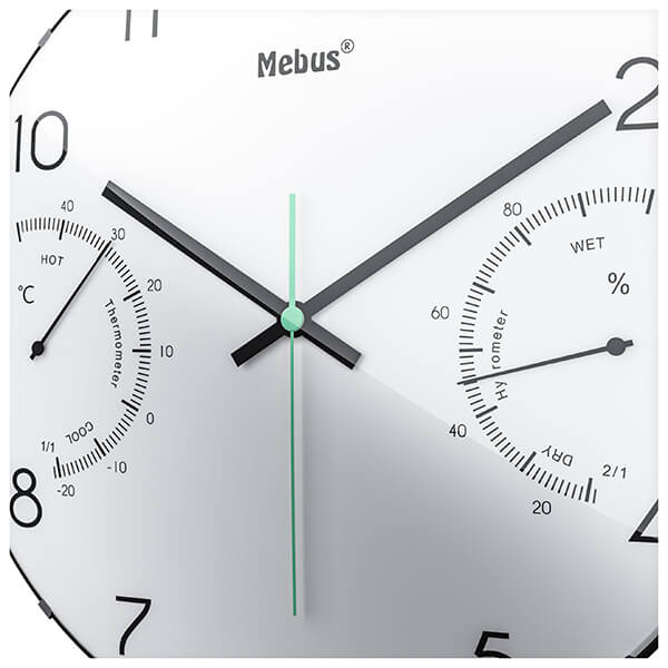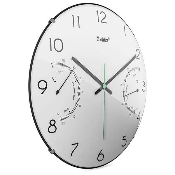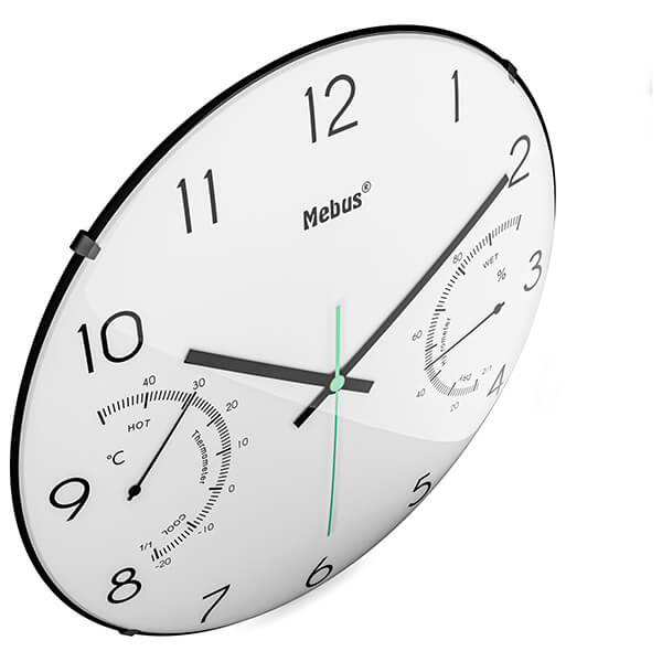 Ρολόι τοίχου Mobus με θερμόμετρο και υγρόμετρο. Χαρακτηριστικά: - Υψηλής ποιότητας κίνηση χαλαζία: Ένα μικρό κρύσταλλο εξασφαλίζει ομαλή λειτουργία. Έτσι, εμφανίζεται αξιόπιστα η σωστή ώρα και αποφεύγονται οι αποκλίσεις. Μπορείτε να βασιστείτε σε αυτό. - Με θερμόμετρο: Δείτε την τρέχουσα θερμοκρασία δωματίου σε °C με μια ματιά. Εξασφαλίστε τη σωστή θερμοκρασία διαβίωσης ή ύπνου και περισσότερη ευεξία. - Με υγρόμετρο: Δείτε με μια ματιά την υγρασία σε ποσοστό (%). - Έγχρωμη έμφαση: Ο δείκτης δευτερόλεπτου είναι σε διαφορετικό χρώμα. Μια οπτική αντίθεση που αφήνει μια σύγχρονη εντύπωση χωρίς να είναι πολύ ενοχλητική. - Ευέλικτη χρήση: ως ρολόι κουζίνας, ρολόι σαλονιού, ρολόι γραφείου ή για υπόγειο, δωμάτιο χόμπι, γκαράζ. Ο διαχρονικός, απλός σχεδιασμός ταιριάζει σχεδόν σε κάθε περιβάλλον. Διαστάσεις: Φ 30 cm.Μπαταρίες: 1x 1.5V type AA (δεν περιλαμβάνονται).Χρώμα: Λευκό.Εγγύηση: 2 χρόνια. DOA 7 ημερών