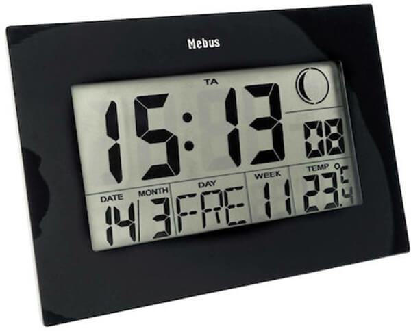 Ρολόι ραδιοελεγχόμενο Mebus. Χαρακτηριστικά: - Ψηφιακό θερμόμετρο εσωτερικού χώρου: Δείτε με μια ματιά την τρέχουσα θερμοκρασία δωματίου σε °C ή °F. - Ραδιοέλεγχος (DCF 77): Το ρολόι τοίχου ρυθμίζεται πλήρως αυτόματα στη σωστή ώρα, συμπεριλαμβανομένης της ρύθμισης της ώρας στη θερινή ή τη χειμερινή ώρα. Η ώρα μπορεί να ρυθμιστεί χειροκίνητα, π.χ. για τοποθεσίες χωρίς ραδιοσήμα. - Εμφάνιση ημερολογίου - (εμφάνιση της ημερομηνίας, της ημέρας της εβδομάδας και της ημερολογιακής εβδομάδας) . - Εμφάνιση φάσης σελήνης: Το ρολόι τοίχου περιλαμβάνει ένα σεληνιακό ημερολόγιο που εμφανίζει οπτικά την τρέχουσα φάση της σελήνης. - 2 ρυθμιζόμενοι χρόνοι ξυπνητηριού συμπεριλαμβανομένων. Ξυπνητήρι επανάληψη/αναβολή/αναβολή. Διαστάσεις: 23 x 16 x 2 cm.Μπαταρίες: 2x 1.5V type AAA (δεν περιλαμβάνονται).Χρώμα: Μαύρο.Εγγύηση: 2 χρόνια. DOA 7 ημερών