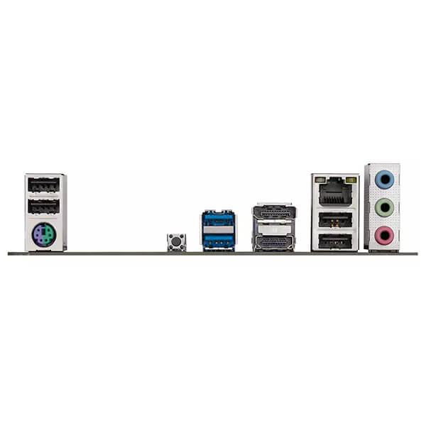 REAR I/O: 4 x USB 2.0/1.1 ports, 1 x PS/2 keyboard/mouse port, 1 x Q-Flash Plus button, 2 x USB 3.2 Gen 1 ports, 1 x RJ-45 port, 3 x audio jacks.