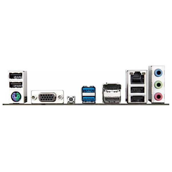 REAR I/O: 4 x USB 2.0/1.1 ports, 1 x PS/2 keyboard/mouse port, 1 x D-Sub port, 1 x Q-Flash Plus button, 2 x USB 3.2 Gen 1 ports, 1 x DisplayPort, 1 x HDMI port, 1 x RJ-45 port, 3 x audio jacks.